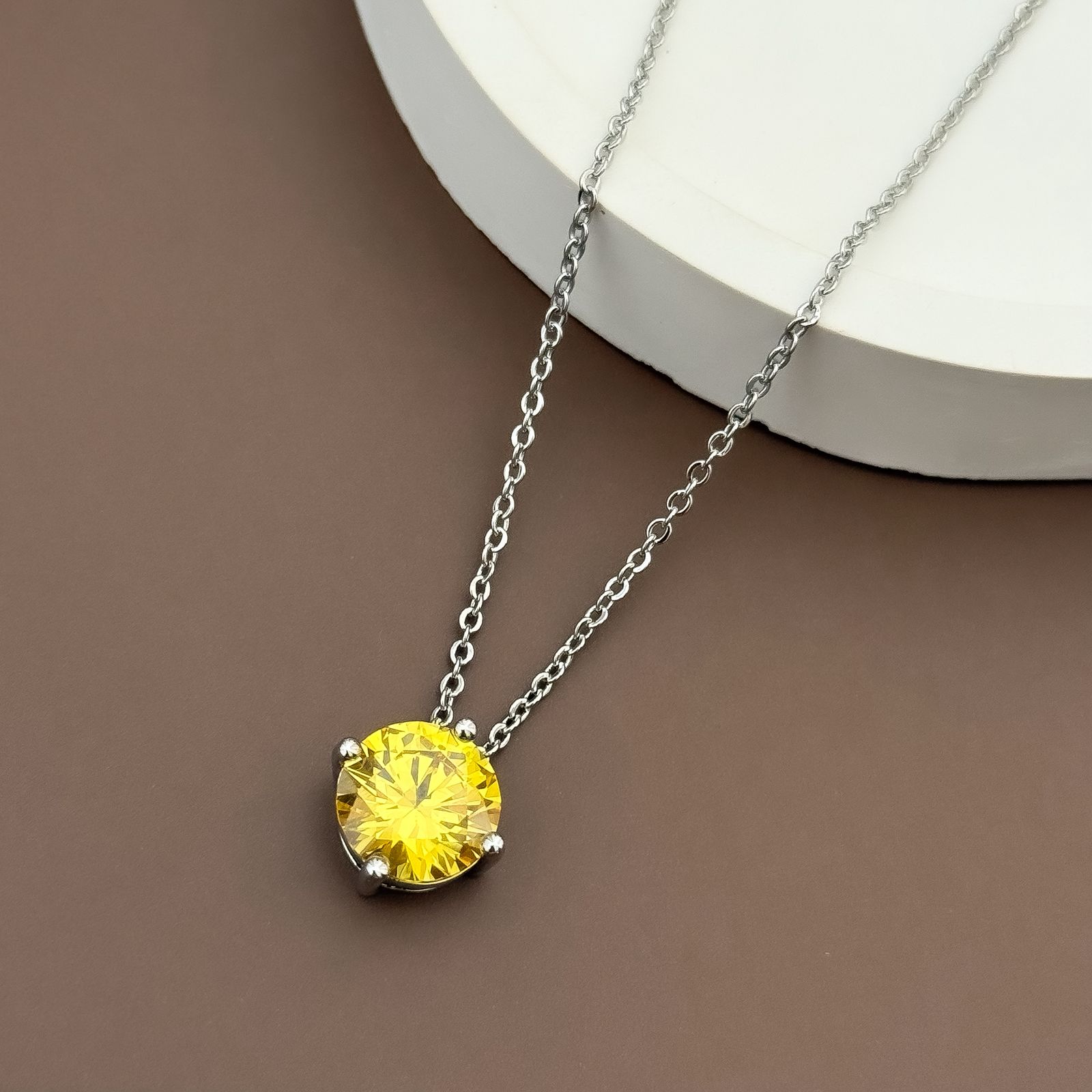 CORRENTE: 45CM COM AJUSTE 50CM. PINGENTE: 10MM. BANHADO A RÓDIO BRANCO. PEDRA ZIRCÔNIA COR CITRINO. NÃO CONTEM NÍQUEL. HIPOALERGÊNICO