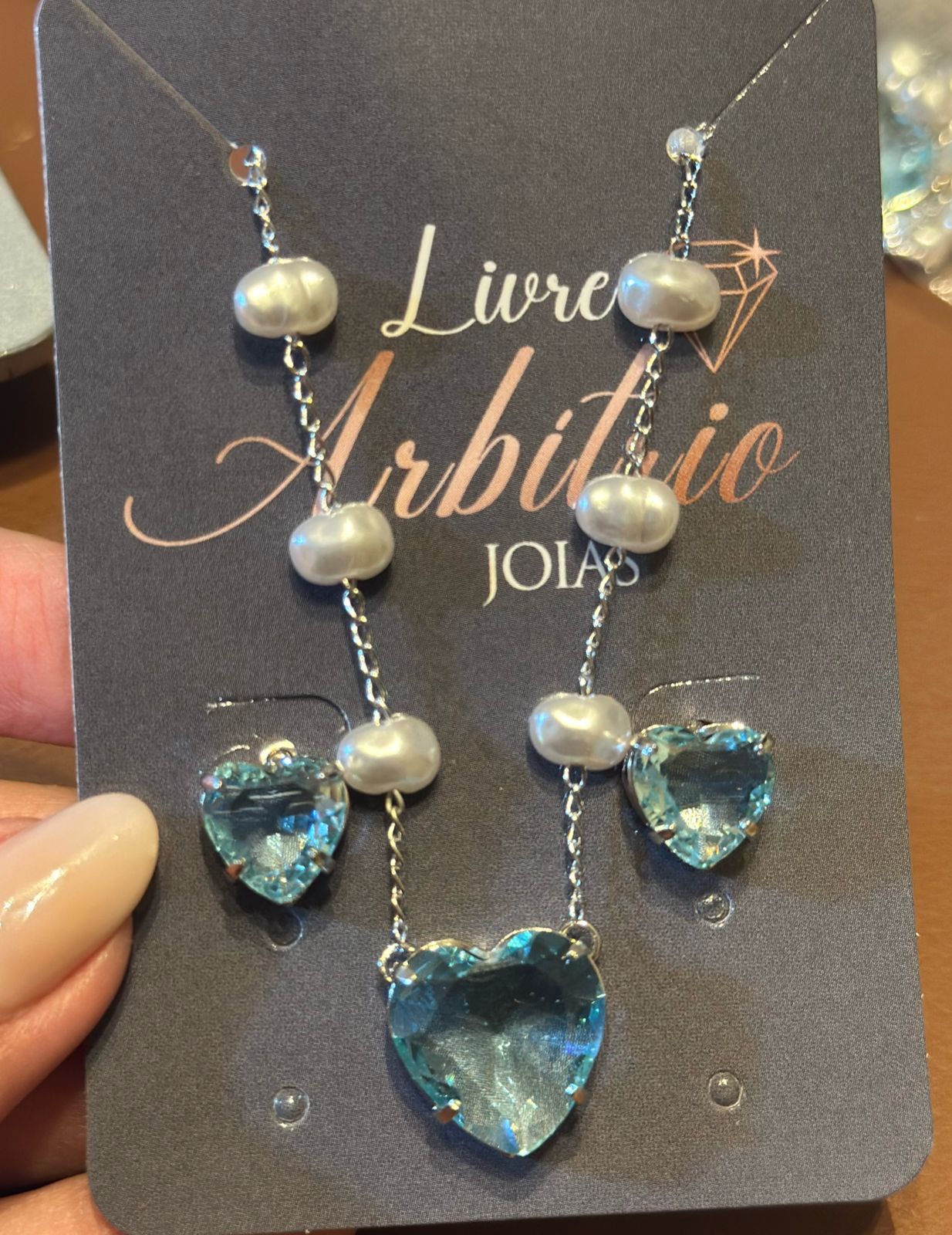 CONJUNTO COLAR E BRINCO CORAÇÃO AZUL PEROLAS